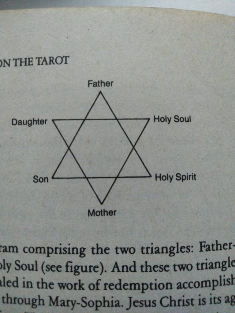 – Natalia had had a dream a few weeks ago, that she wrote down but didn’t think much of, until after reading the notes on the previous Ace of Cups conversations recently. In the dream she was hovering above the Earth and then heard a voice saying that the “Mary Triangle” was descending from above, and the “Holy Soul or Mary Magdalene Triangle” was ascending from below. And when they intermingle, there is the 7th, the Child. Then she read the notes, where we were talking about the Holy Trinity intermingling with the Trinosophia, and this hexagram creating a cube in the middle, a new creation—like the New Jerusalem. And she began to think wow this might have something to do with this dream.