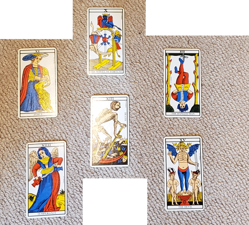 – This sequence is so contextual, one needs the backstory. It isn’t like the other YHVH sequences that can more or less be taken in isolation. One sees the sequence Death, Temperance, The Devil and wants to know “how did we get here? what will happen next?” The backstory is the Wheel of Fortune, the intermingling of Fallen and Unfallen Nature. Somewhere in the 10th or 11th Letter/Meditations, Tomberg makes reference to scientists who see survival of the fittest as “normal” Nature being like doctors who see sickness as the “normal” healthy state of the body. In the Wheel of Fortune, both the healthy and the ill are still intermingled – the monkey is the healthy becoming ill, and the dog is the ill becoming healthy. Then there is a process of peeling back the layers, seeing what is in the Wheel, a process of purgation and separation. The Wheel of Fortune is a bit like the almost three year old child, ready to take the developmental leap – but in order to make the leap, there must be fever, vomiting. After that what was once intermingled (the earlier state of the child) has become irrevocably separated (vomit/purgation—and—more advanced child). It is the same with the process from Wheel of Fortune through The Devil – once separated, Temperance and The Devil CANNOT be recombined!