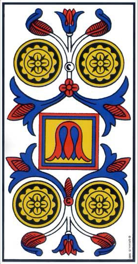 – Compare the Four of Cups to the Four of Coins—the central piece of the Four of Coins is totally disruptive, and out of place. In contrast to the Four of Cups, where it feels as though it’s quite natural: “oh, there are two above us and two below us.” And out of feeling capable, of really knowing how to honour the above from below, this central flower just naturally finds its place, waiting patiently to become the fifth.