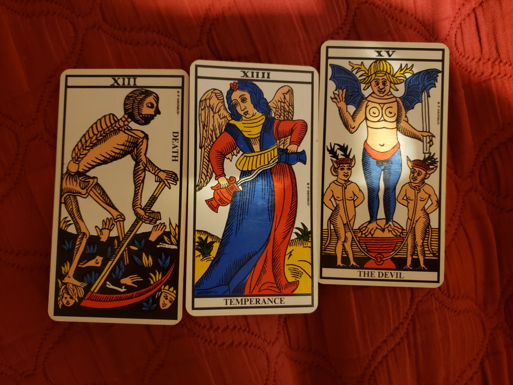 – Reminiscent of Psalm 23 “Though I walk through the valley of the Shadow of Death, I fear no Evil for Thou art with me.” Death/Thou/Evil = Death/Temperance/Devil