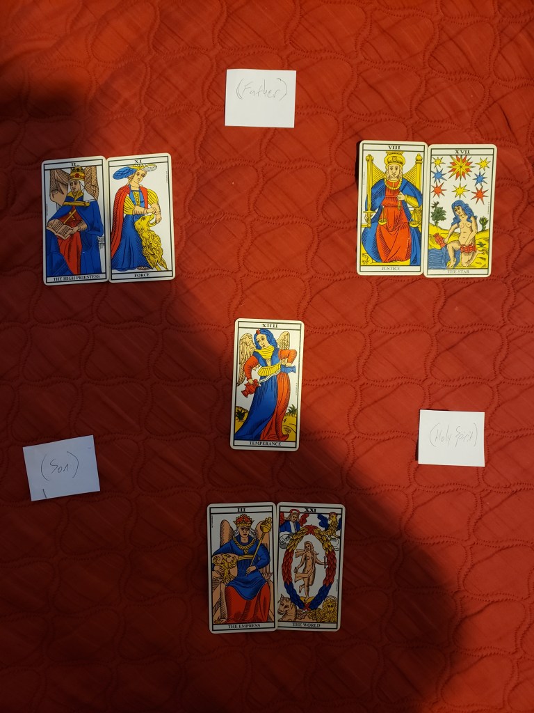 The World could stand in the middle as a sort of Fullness. However, we can see a numerological relationship developing – High Priestess and Force are both = 2; Justice and The Star are both = 8. The Empress = 3. If we consider The Fool = 0, then The World = 3 (21=3). Possibly it is Temperance who dwells in the middle, maintaining the flow of connections between the three aspects of the Trinity? Then The World becomes another aspect of the Mother. Here we have the Fibonacci sequence: 2 (Daughter), 3 (Mother), 5 (Middle), and 8 (Holy Soul).