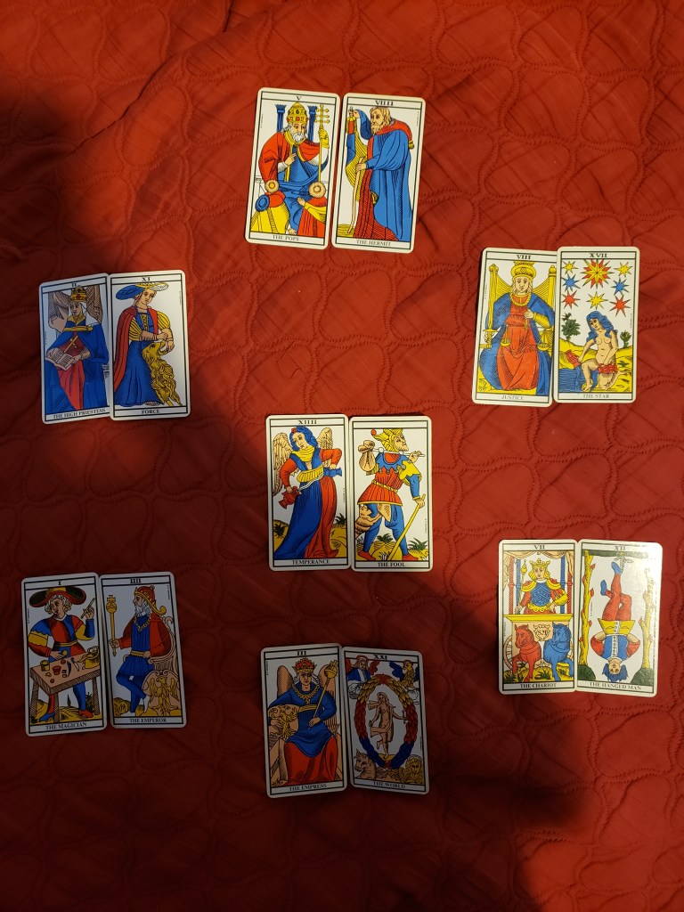 – The first 9 Arcana portray the way things are in potential – eternal archetypes/ideals. From the 10th onward, karma is on display, the fallen nature. A story begins to unfold that one is planted into and has to figure out. It is like when one first begins to discover a spiritual path, e.g. Anthroposophy, and studies it alone. This is a lonely but relatively easy experience. Then one meets other Anthroposophists, becomes involved in initiatives and the Society at large. The drama that permeates all of these working groups, the karma, is another thing to deal with entirely – another level of the spiritual path, the one that works with many other people rather than alone.