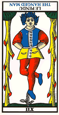 – When the image of the Hanged Man is looked at upside-down, it appears as though he is dancing an Irish Jig. We noted last time that at first it appears as though he is being hung to be butchered, it a state of torture. By the end of the conversation, it seemed as though he was performing acrobatics in the midst of his suffering. Simply by a reversal of “gravitation,” he is either being tortured or is dancing.