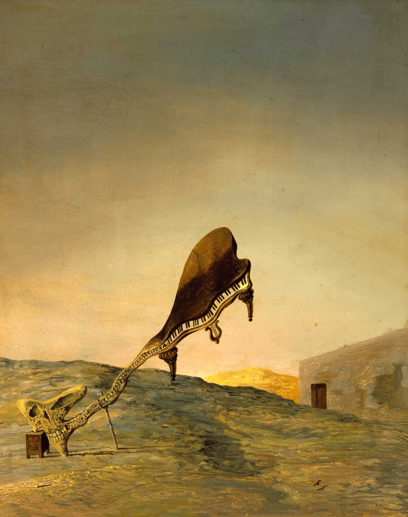 The melting piano form resonates somehow with the yellow fringe on his left shoulder, although quite different.