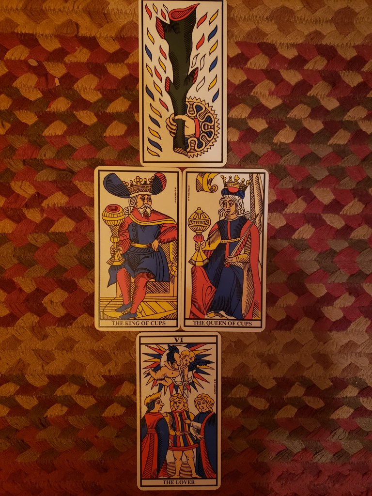 We began to play with Ace of Batons, King and Queen of Cups, and the Lover: