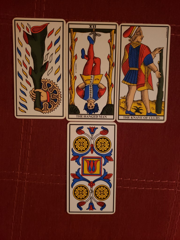 So we have the Ace = upright vertical, Hanged Man = horizontal, and the Knave of Batons = down-facing vertical. A kind of progression here, and we can imagine the Hanged Man being lowered into the Four of Coins’ pit of hell.