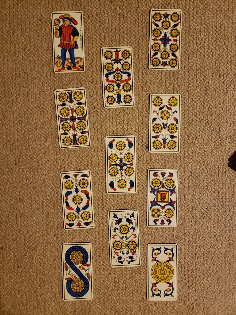 – The Knave is asking us to somehow see all Ten Coins as a whole. What until now has been separate pieces of a process (a how), we must now see as a wholeness, a “what.”