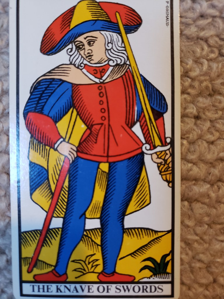 – At the same time as we’re discussing all of this, or even before, feeling a comparison and contrast between the gesture of the Knave of Coins vs the Knave of Swords.