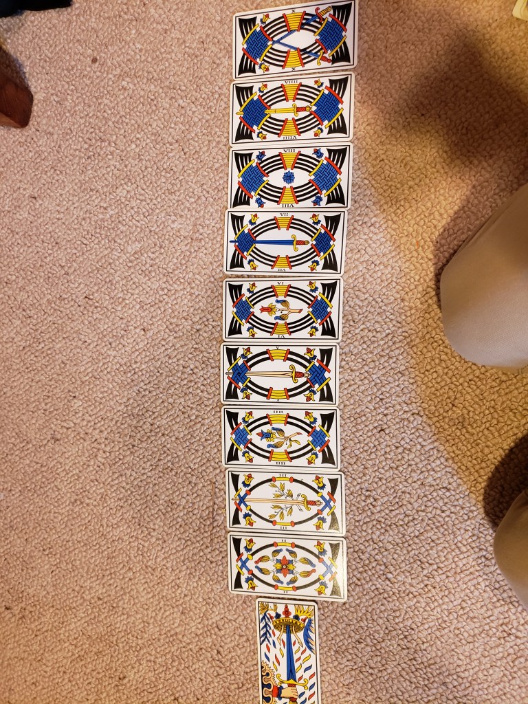 Second of all, clarifying that before we had been under the impression that the sequence of Dante’s initiation was Purgatorio—Inferno—Paradiso. But it actually begins with the Inferno, then Purgatorio, then Paradiso. Not exactly matching out experience of the Coins (Purgatory) and Swords (Inferno).