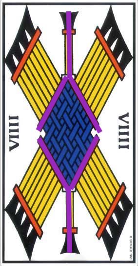 There is almost the presence of a being, like we saw in the Coins and Cups. The white diamonds created by the negative space on the sides would be eyes. A face–no, many faces, like a Hindu God with many faces.