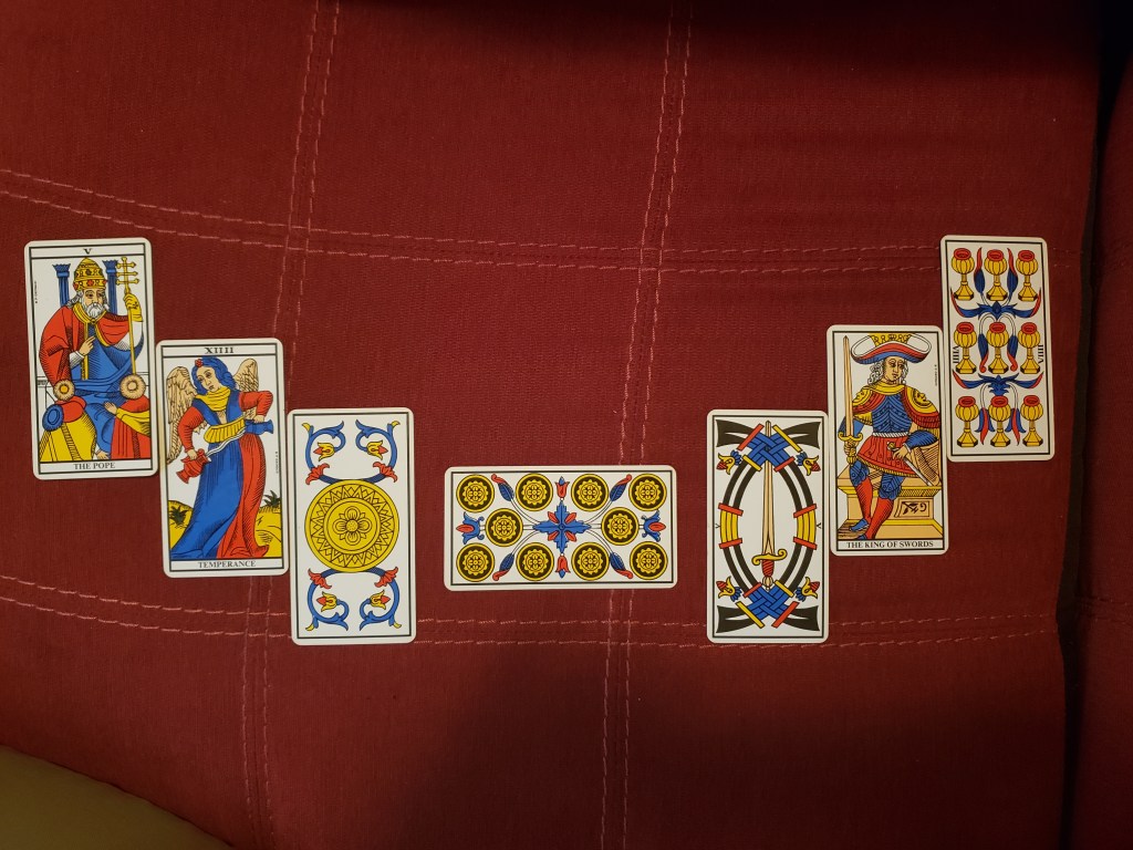 Going back to the mirroring above…if the Ten of Coins holds the center, and the Ace of Coins is mirrored in the Five of Swords, and Temperance is mirrored in the King of Swords…then we ought to be asking ourselves what the relationship is between the Pope and the Nine of Cups?
