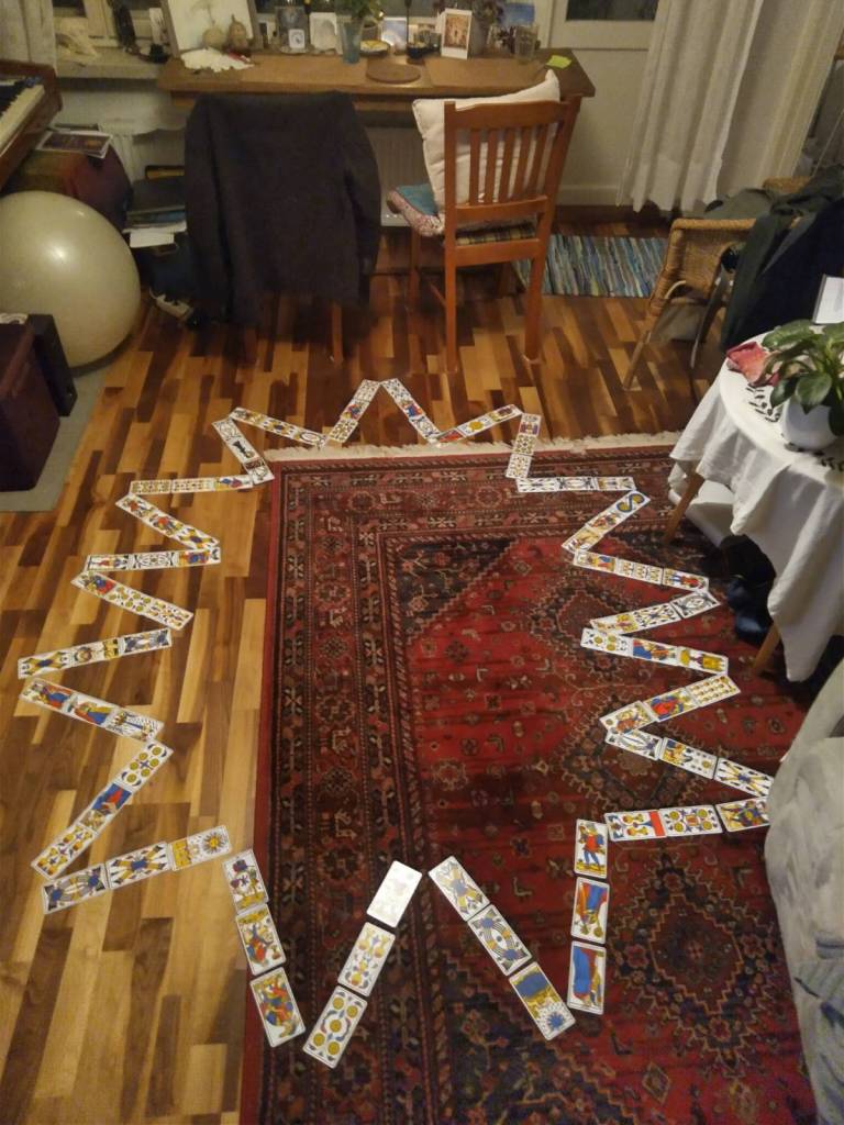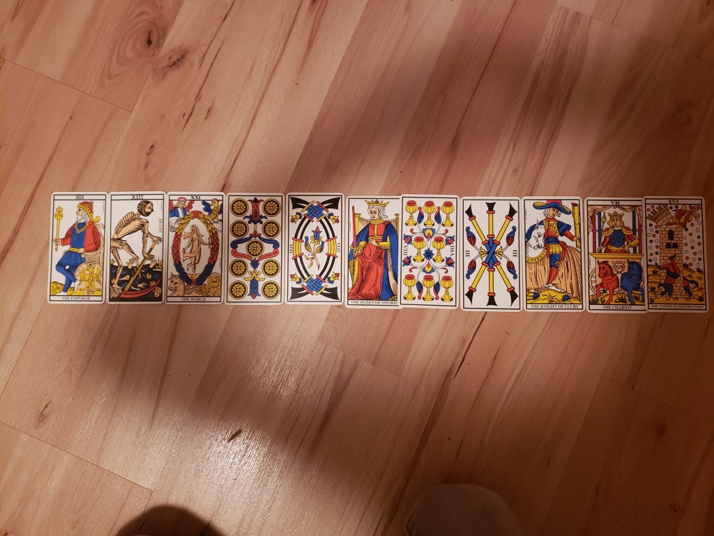 Three—Empress (3), Hanged Man (12), The Fool (21), Eight of Coins (30), Three of Swords (39), Knight of Swords (48), Seven of Cups (57), Two of Batons (66), Knave of Batons (75), Lover (84), Devil (93)