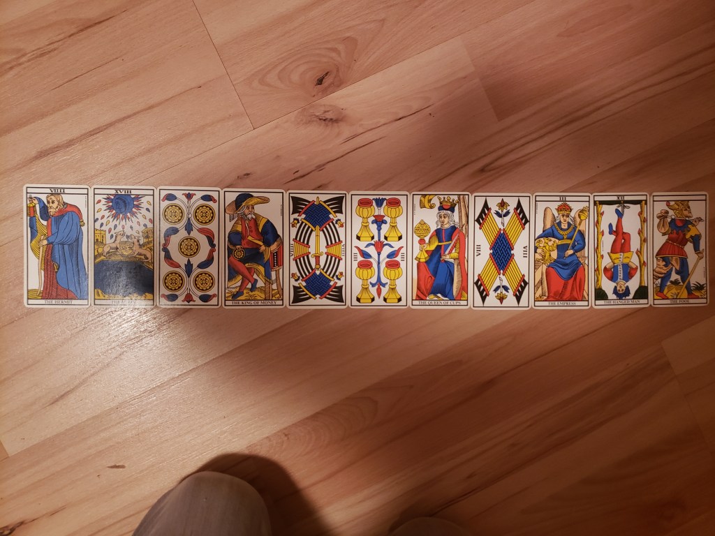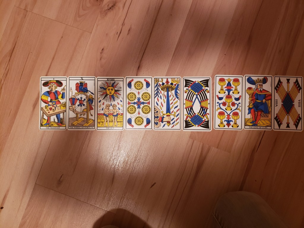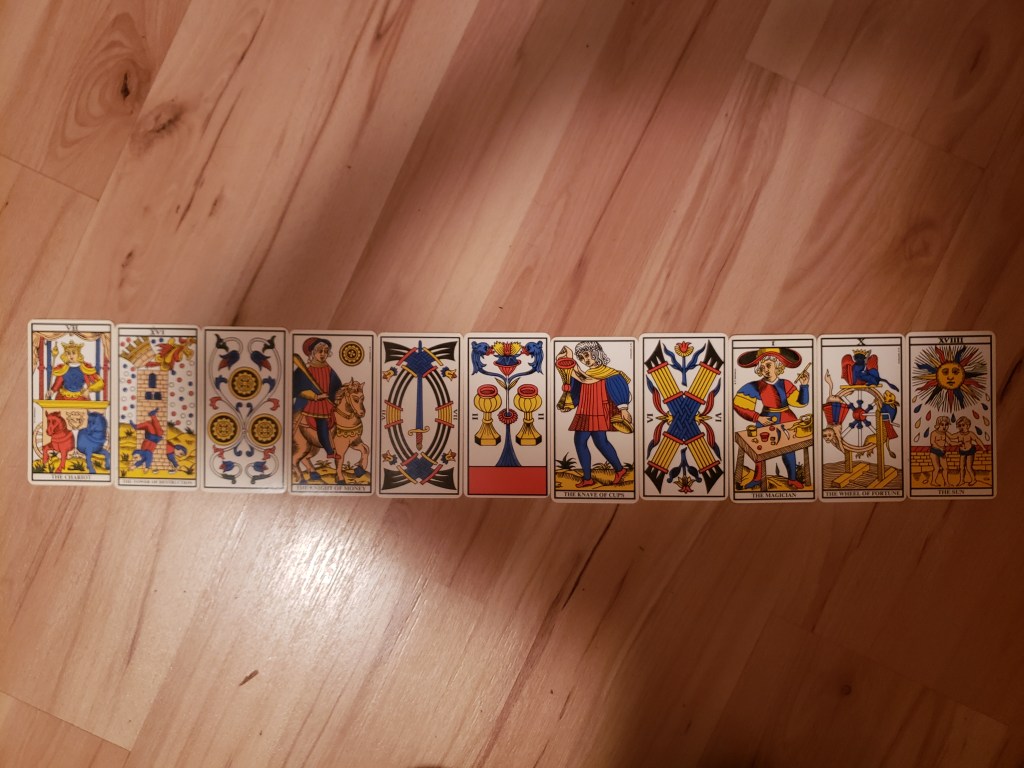 Eight—Justice (8), The Star (17), Four of Coins (26), Queen of Coins (35), Eight of Swords (44), Three of Cups (53), Knight of Cups (62), Seven of Batons (71), High Priestess (80), Force (89), The Judgement (98)