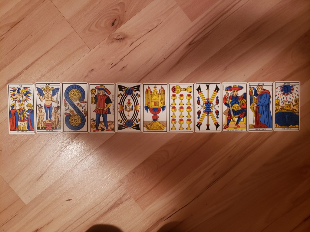 Six—Lover (6), Devil (15), Two of Coins (24), Knave of Coins (33), Six of Swords (42), Ace of Cups (51), Ten of Cups (60), Five of Batons (69), King of Batons (78), The Hermit (87), The Moon (96)