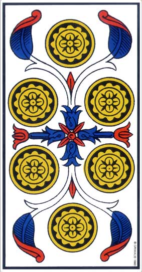 In the Two of Coins, there is an expression of the sevenfold (seven parts to the ribbon, with the name/ego in the center). A biographical unfolding. No crystalline structure. We only see the order in our biographies in hindsight.