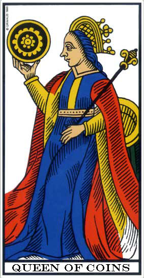 The Queen of Coins’ baton is like the Charioteer’s. And the Knight of Coins’ baton is like the staff of the Fool. These batons are just holdovers from the Majors, not images of what is to come.