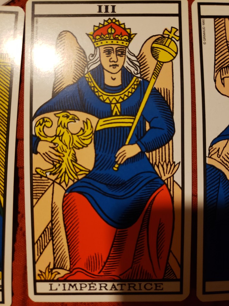 The gesture of the Queen’s hand is actually more like Justice’s holding the scale as opposed to the Empress’s holding the sceptre. But with the Queen she’s just caressing or resting her hand on her belly.