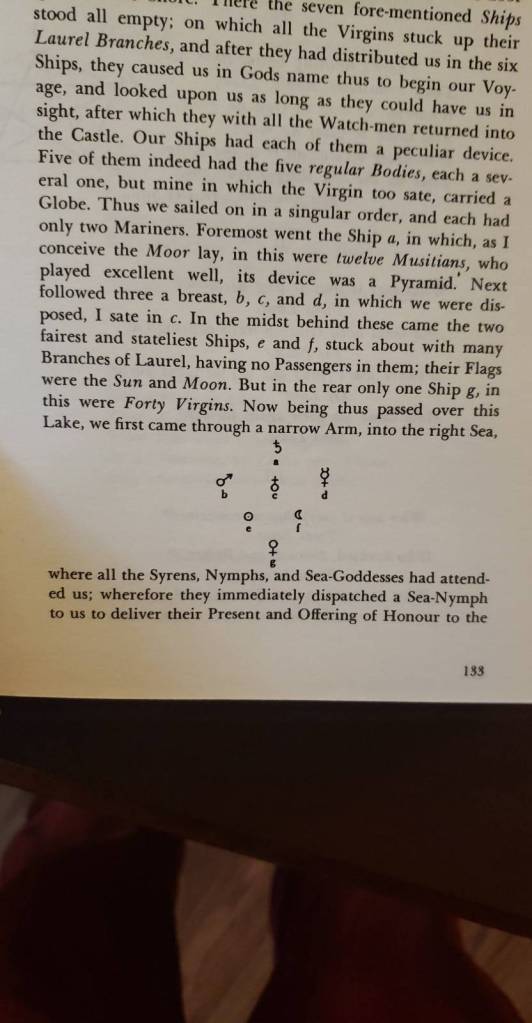 Joel responds…Yes! And interesting how on the way the boats are planetary, and on the return they are zodiacal. Which again makes him think of the journey of the soul through the planetary spheres to the midnight hour/realm of fixed stars after death. And he could tell in his translation, which is a bit arcane, but it did seem like CR goes to bed thinking he will awake the next morning as the gatekeeper, but instead he sleeps for two days straight and awakes back at home. So a kind of ambivalent, paradoxical ending. This is akin to the ending of George MacDonald’s Lilith. It ends with the main character experiencing two biographies simultaneously, one in the waking realm and the other in the realm of sleep. It is equally bittersweet and ambiguous. And this is pretty much how Joel’s life feels all the time!