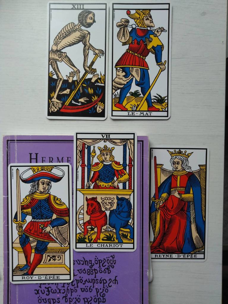 Natalia shares some Arcana that have come up in different occasions, somehow connected to the Chymical Wedding’s first and second day. The Six of Cups, the rope where people try to catch on in the first dream. The Fool when he is running to the road. The Chariot with SM sign on it as on the coin he receives. The Hanged Man as the people hanging in the second dream. Maybe Libra (i.e., Justice) too as they wait for the morning to be judged, weighed.