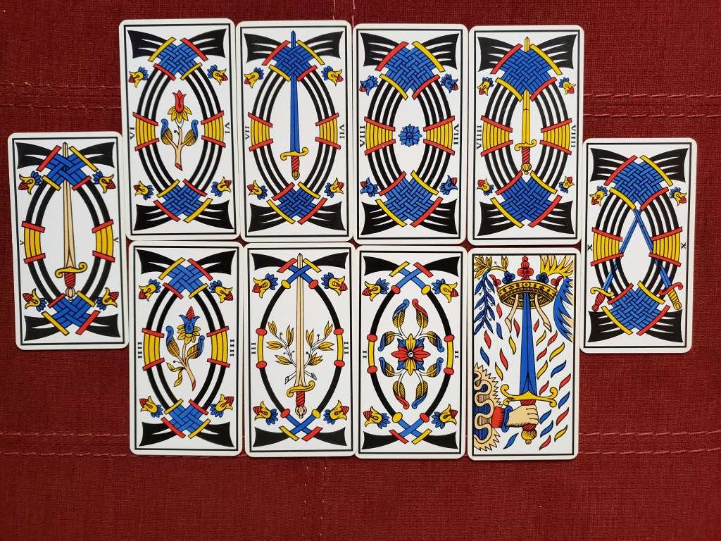 We had forgotten how different the Two of Swords was, with its little ovals of red and yellow rather than bars or lines. In fact, the Three is the same way.