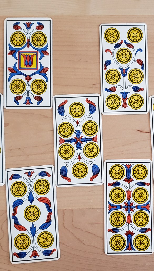 – Looking at Four, Five, Six: the Six inverts the Five but somehow recapitulates the Four. The Fourfoldness is so strong in the very center of the Arcanum (the cross-like flower image), but also if one were to cover the upper and lower single coins, we would be left with an image very much akin to the Four of Coins. It’s as though we are getting to see a more complete picture of the Four.