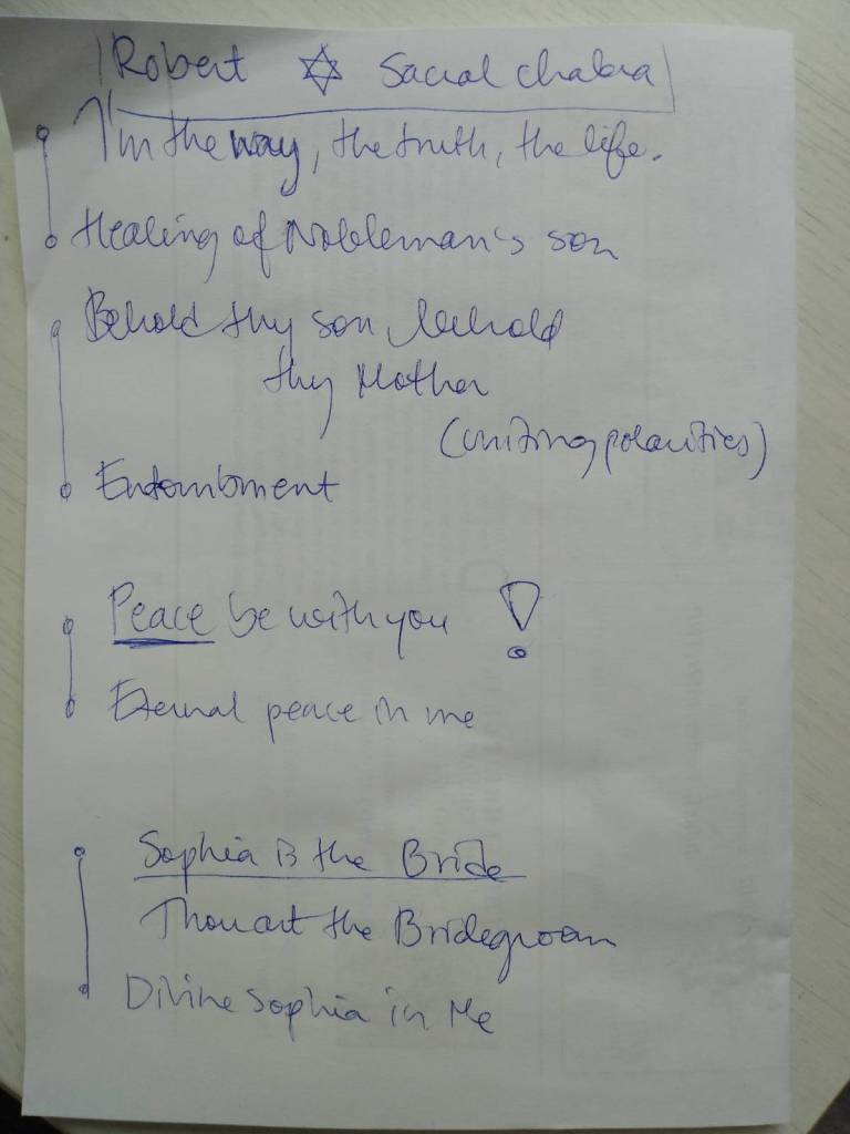 Joel is also remembering something from back when we were discussing Natalia’s dream, we were talking about the Masters (Skythianos, Mani, etc). And she spoke of Judith von Halle’s research, which indicates there being Masters of the South, East and West, and Rudolf Steiner who works in all directions—but no Master for the North. And in the Esoteric Lessons, Rudolf Steiner describes the setting for the Masonic rituals—three altars, one in the East, West and South, but the North has no altar—instead it has the two pillars of Jachin and Boaz. At one of the altars the Bible is there open to John 13—which is the foot washing. And Joel only discovered this after he had already decided on John 13 as the main reading and inspiration for the ritual.