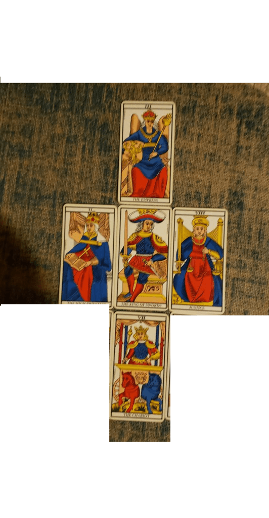 We can see its connection to the King of Swords. Then if we add in the Arcanum that comes before Justice, The Chariot: