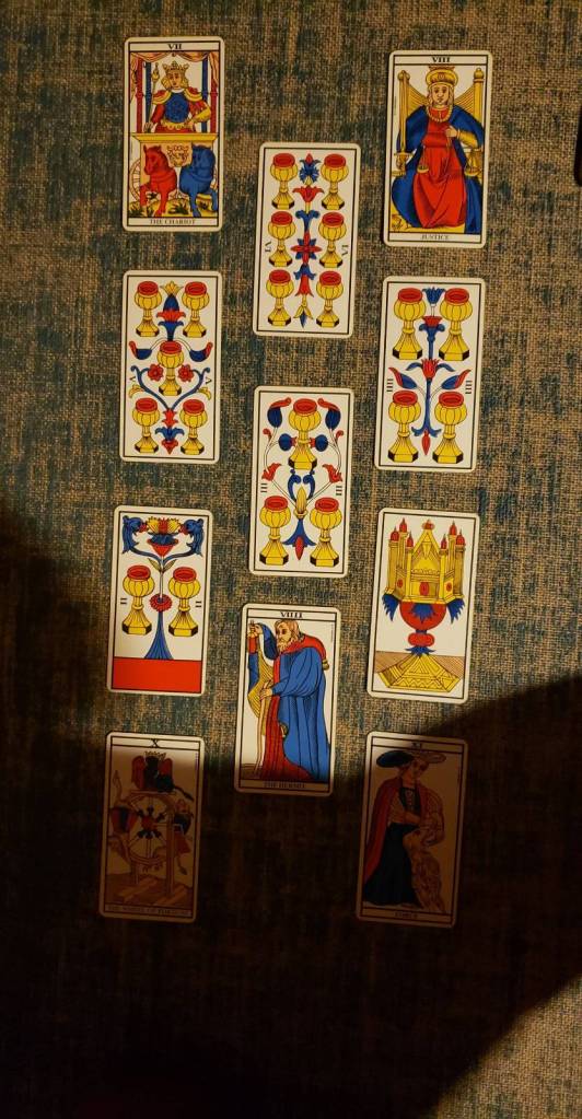 Maybe Seven, Eight, and Nine tell a whole tale, but then the Ten stands apart because it’s so stark and crowded. Much less efficient to fit ten cups on a single card vs ten swords…