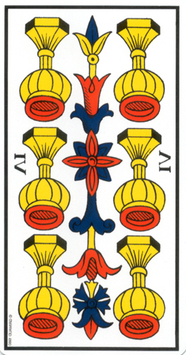 From Three to Four you have a natural evolution due to a cut. Then between Four and Five you have to do some real mental gymnastics to imagine the metamorphosis, akin to the activity we had to do throughout the Suit of Coins. A trickier metamorphosis, not just a simple development from a cut.