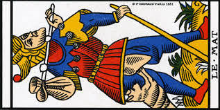 – And what about the Fool? Does he have eyes on his belt? Almost like a profile view of the eye…there would be four eyes on his belt. When you look at the Fool sideways, this belt almost reminds you of one of these central plant/spear beings in the Suit of Cups. It also looks like a recorder, or bells.