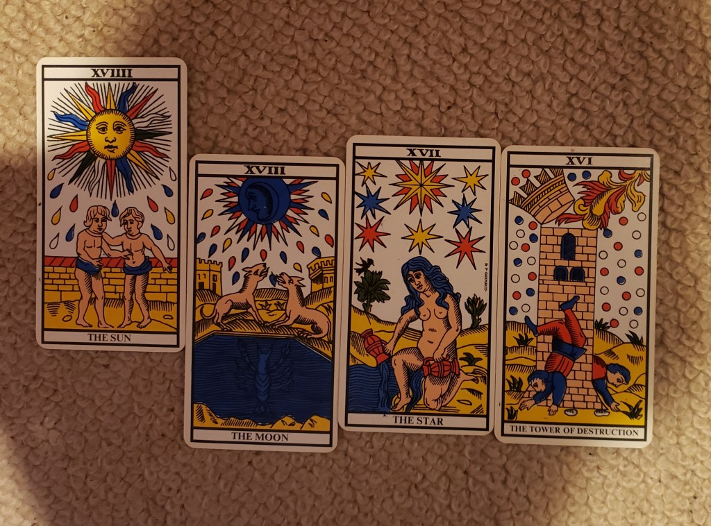 Whereas Justice, Wheel of Fortune, Hanged Man, and the Devil are warnings and messages, The Sun is like an offering, a gift, not so much a message.