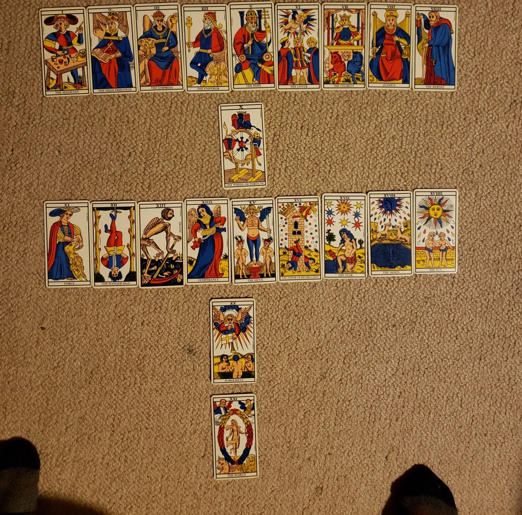 And that under this scheme, Wheel of Fortune, Judgement and World take on a special significance, in that they stand alone. But really, this scheme should begin with the “Zero” arcanum, The Fool. The Fool should stand alone at the very beginning: He wanders through the first 9 arcana, collecting qualities as he develops. Then with Wheel of Fortune, he is thrown into the blender, the cyclone of world events and drama, which he travels from 11-19. Then in the Judgement he is resurrected into the ultimate state of being, The World.
