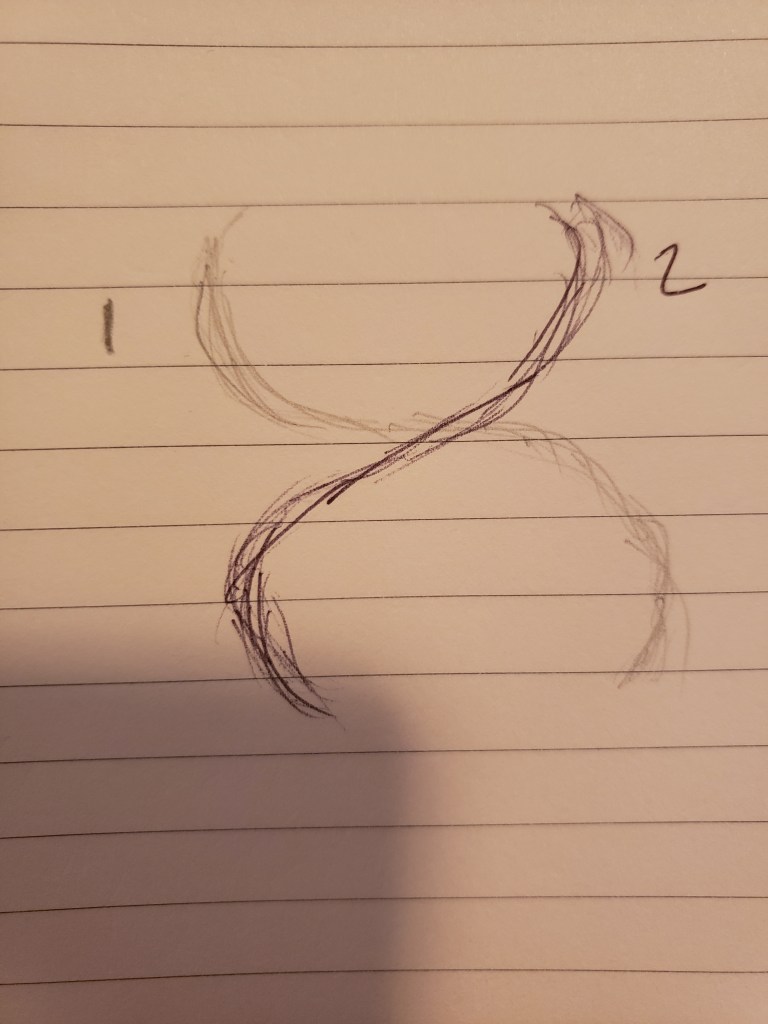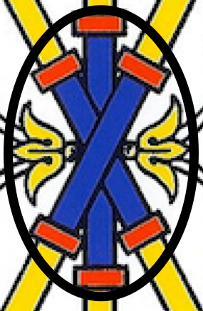We can see the black portions as the rubber on the tire. The yellow portions are the spokes of the wheel. The blue is the hub. It’s more like a bike tire, but as though the tire were see through part of the time. We really can’t get that impression at all in the Two of Batons, despite the similarity of form overall in many ways. There is no central (vertical) axis in the Two of Batons.