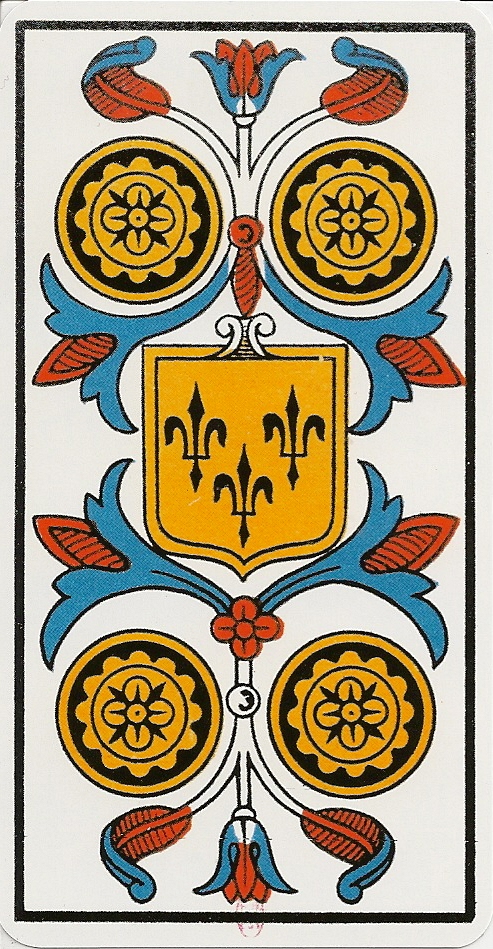 – Joel is remembering that in older versions of the Grimaud/Marteau Tarot of Marseilles decks, the central flower in the Four of Coins was a Fleur-de-Lis, and only later replaced with the more tulip formed flower. And that in the Two of Cups, the bottom portion was not just a block of red—it had one or several Fleur-de-Lis in it. (Note—actually, the Two of Cups was only like this in the Arnoult deck, upon which the Grimaud/Marteau deck was based. It had the same forms, but different coloration.)