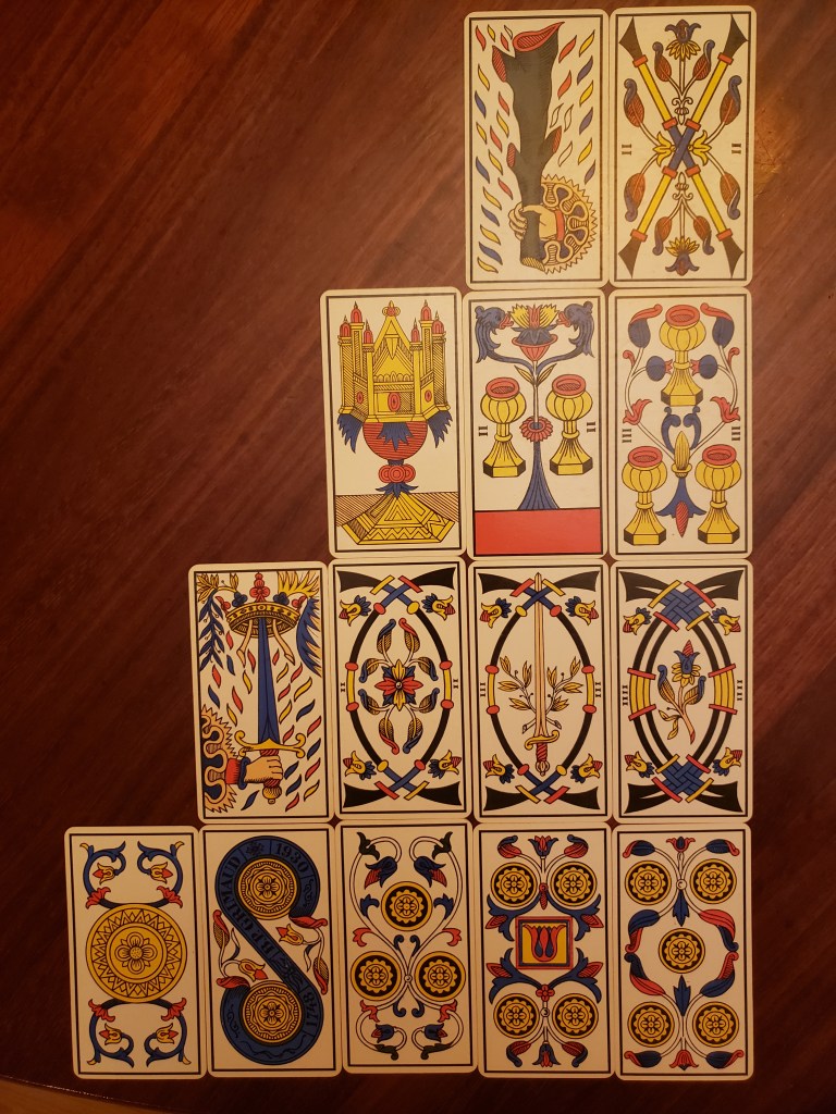 The Two of Cups lifts up, all the way to the fish—now the Two of Batons dips back down, back to egg? A regression of sorts. Maybe it’s like the fish went upstream to spawn—now we have the egg.