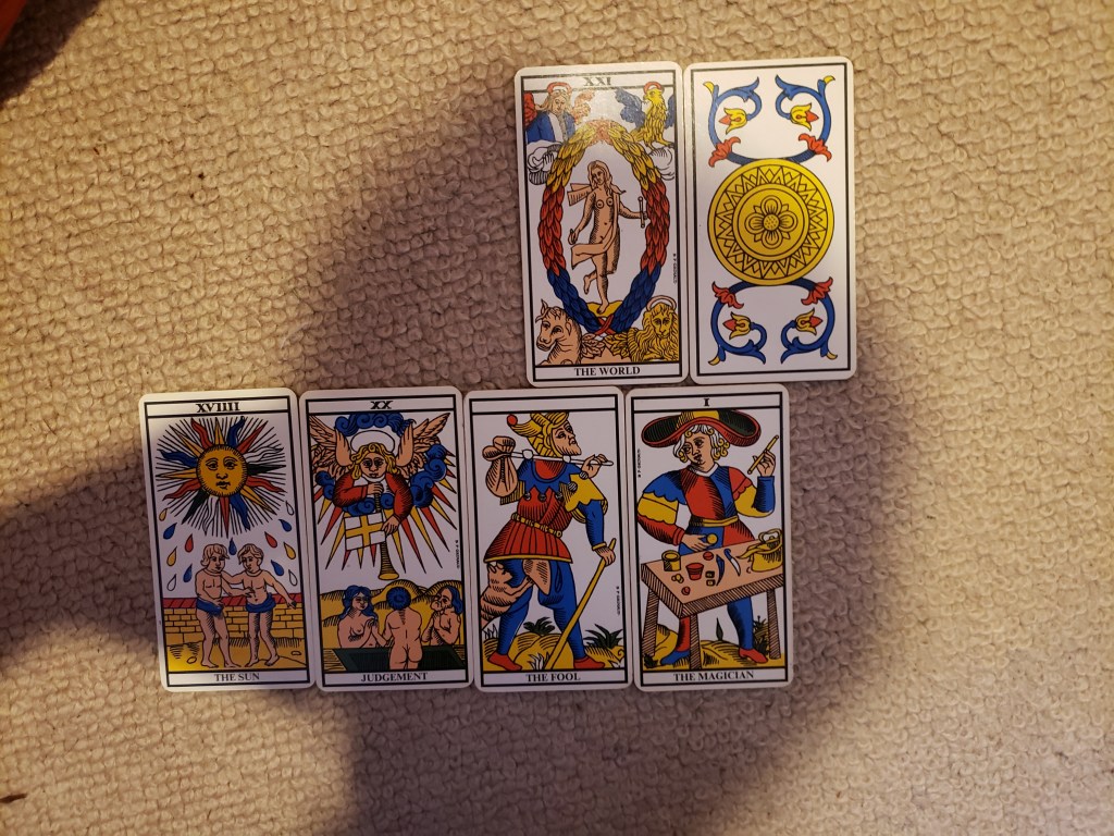 Here we have The Fool wandering over to become the Magician, but he is busy daydreaming about The World: see how he is looking up, and not ahead? He only has eyes for her, his Muse, his Divine Ideal. Then we have the Ace of Coins as a kind of zooming in on the Magician. Like we are taking a very close look at the coin that he is holding in his right hand.